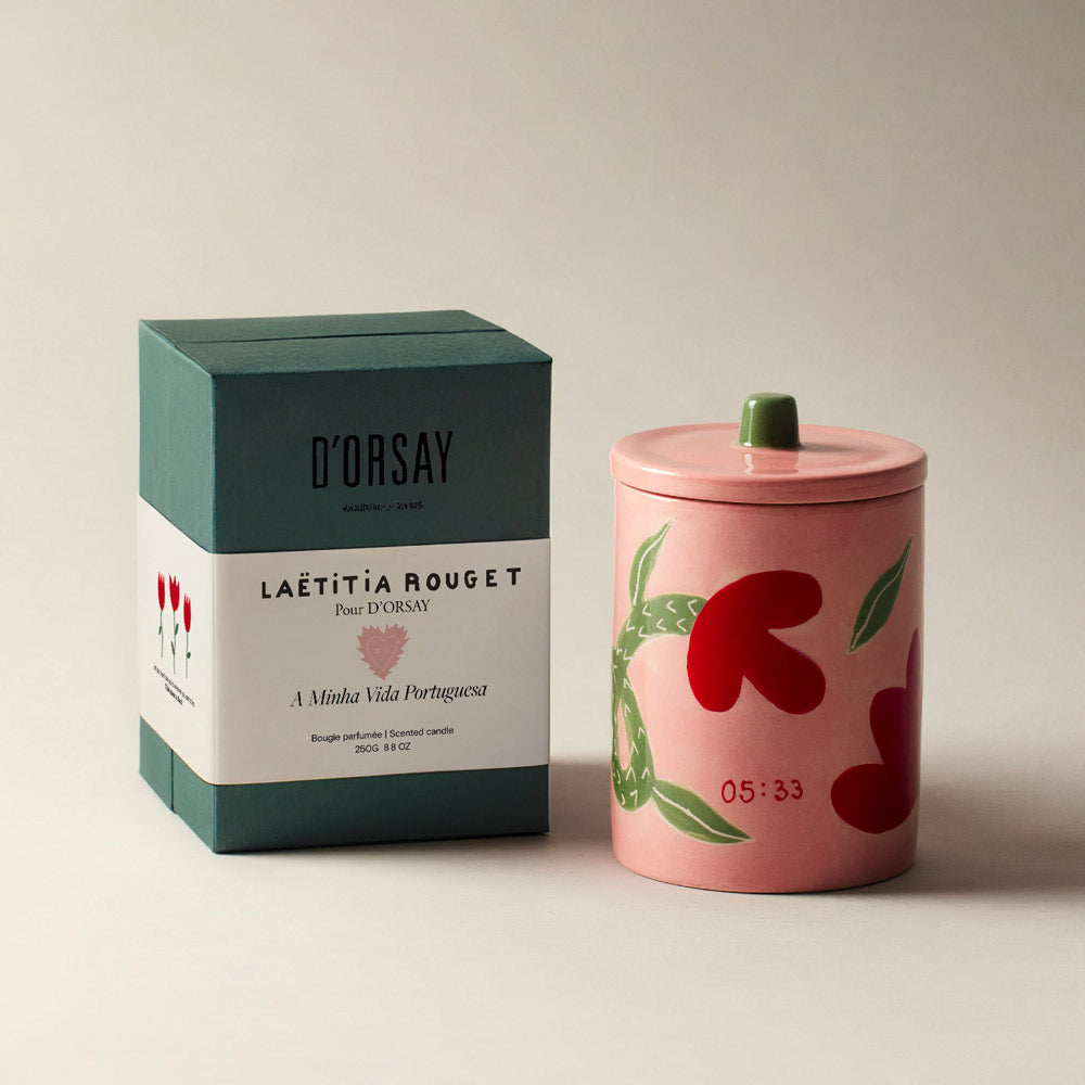 Perpaduan antara keramik Laëtitia Rouget yang jenaka dan dimensi olfaktori D'ORSAY menawarkan perspektif baru tentang romansa. Melalui kreasi tiga lilin, aroma ini membawa kita langsung ke negara adopsi sang seniman, Portugal.